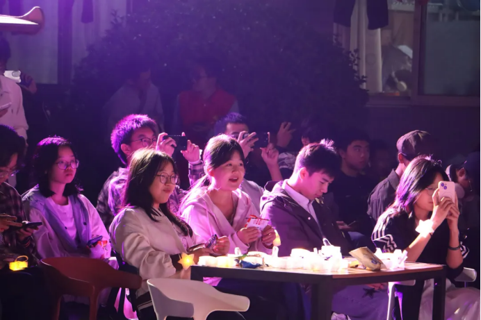 舞台上的歌声未落,台下的共鸣早已沸腾。同学们或围坐于场下,伴着旋律轻轻摇晃手机闪光灯,将点点光亮汇成夏夜里的“星海”;或三两并肩而立,跟着熟悉的歌词轻声合唱,偶尔与身旁伙伴相视一笑,把默契藏进节奏里。当唱到青春共鸣的段落时,台下自发响起的掌声与欢呼声此起彼伏,有人举着荧光棒挥舞,有人随着节拍点头,目光始终追随着舞台——没有刻意的互动,却处处是青春同频的热烈,每一段歌声里,都藏着台下观众最真切的聆听与共情。