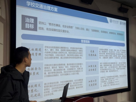 最后,李晶老师介绍保卫处关于校园交通治理方案,涵盖车辆统计、单行道规划、临时交通管控等措施;同时通过问卷调查,向师生征询交通管理规定制定建议。