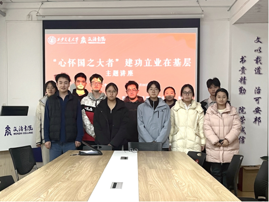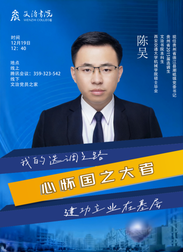 为引导青年学子扎根基层、服务国家,文治书院党总支于12月19日中午举办“心怀国之大者 党员建功基层”报告会。本次会议特邀贵州省德江县潮砥镇党委书记、文治书院本科生及机械学院2015届硕士毕业生陈吴校友做线上分享,由文治党总支秘书马福龙老师主持,书院40余名入党积极分子通过线上线下的方式参与。陈吴校友以自身扎根贵州基层10余年的奋斗历程,从选调初衷、坚守奋进、收获感悟等维度,为学子们带来了一场直击心灵的成长分享。
