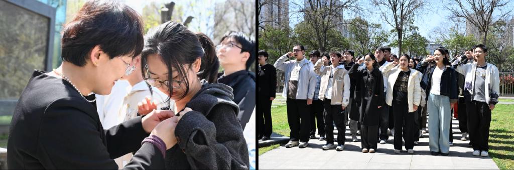 党徽佩戴环节,各位老师为新入党党员佩戴党徽,提醒全体党员明确身份、铭记义务、牢记责任、争做先锋,以党徽为激励与鞭策,时刻保持昂扬奋进姿态,践行党员使命。随后,全体参会党员在党旗见证下重温入党誓词。