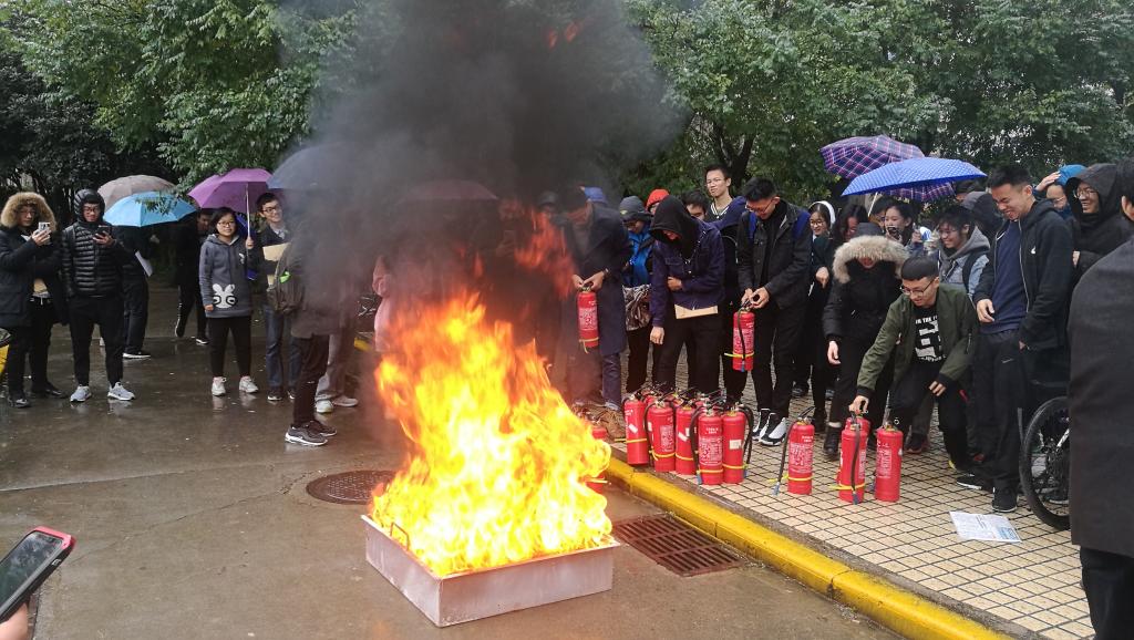 11月7日,文治书院开展消防知识宣传和学习教育活动,活动结束后教学使用灭火器的方法,保卫处崔军、物业服务中心公寓部主任贾亚新参加。