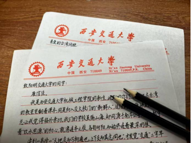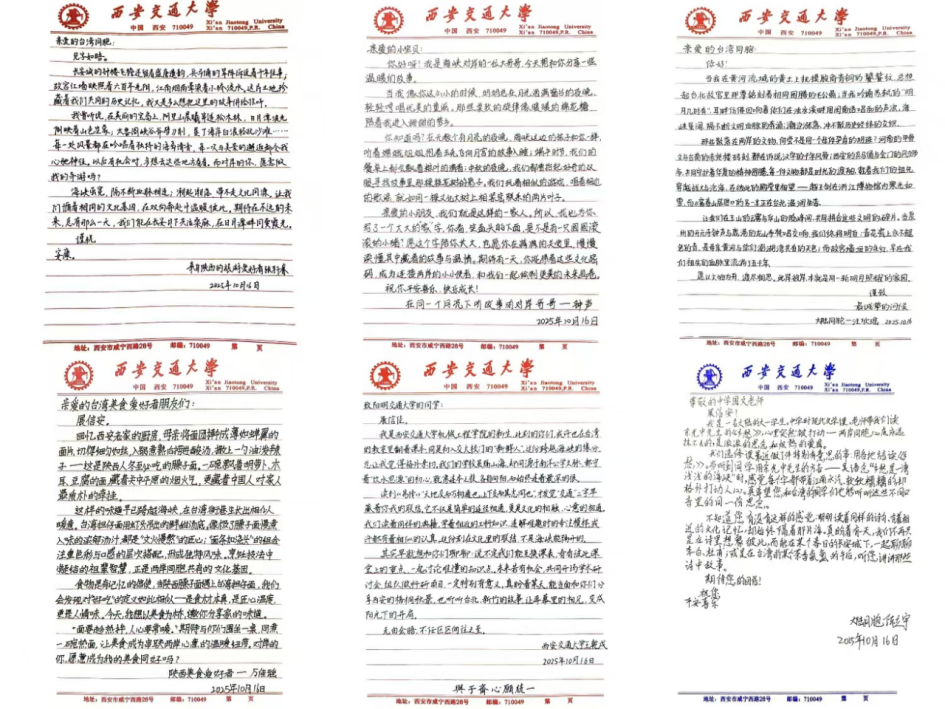 第一封是张轩睿写给给台湾旅游爱好者的信,细数长安钟楼与阿里山的风光,盼台湾同胞当向导共赏山河;第二封是钟声写给台湾刚识字的儿童的信,用嫦娥故事、端午粽叶牵起童年共鸣,也有给台湾小宝贝画“藏着小猪的‘家’字”;第三封是汪欣瑶写给台湾文物爱好者的信,以殷商青铜、《富春山居图》证文明同源,呼吁拼合文化碎片;第四封是万佳瑶写给台湾美食爱好者的信,聊臊子面与担仔面的“文火匠心”,邀共品热面暖人心;第五封是王乾戌写给台湾阳明交通大学新生的信,提“饮水思源”校脉,盼学术合作、线下并肩;第六封是陈立宇写给台湾中学国文老师的信,忆读《乡愁》的感动,分享吴语读诗的温柔,盼与台湾国文老师共聊诗词。